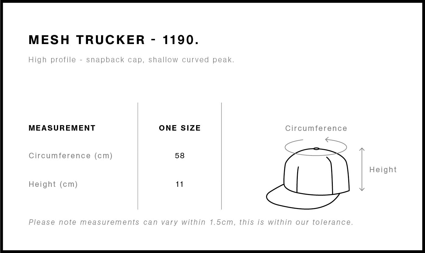 Fabric : Mid weight 60% cotton 40% Recycled Polyester front and peak, 100% Recycled polyester mesh back